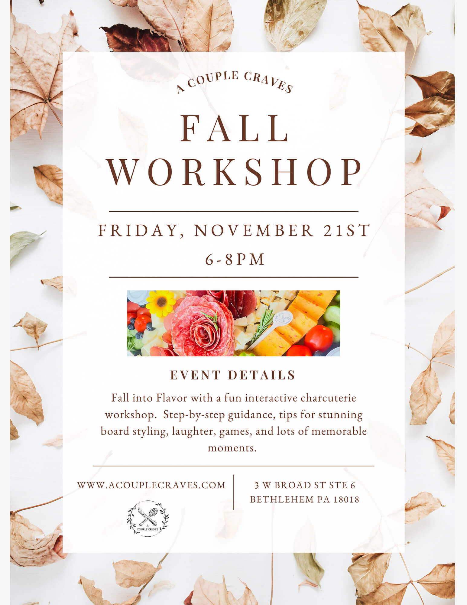 Fall into Flavor with a fun interactive charcuterie workshop, set by step guidance, tips for stunning board styling, laughter, games, and lots of memorable moments.