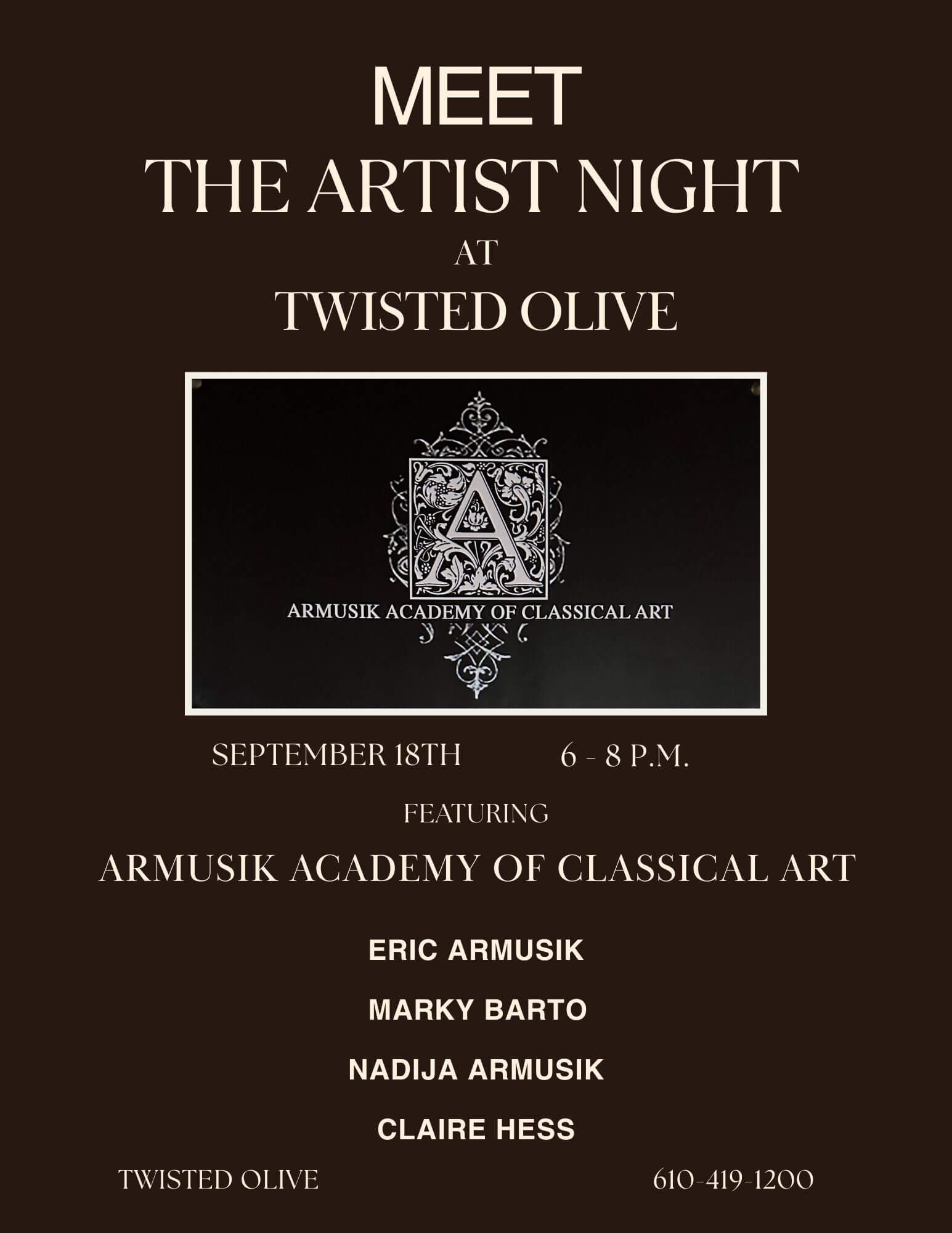 Come in and meet with our current local artists showing at Twisted Olive! Artists will be available to meet with from 6 - 8!